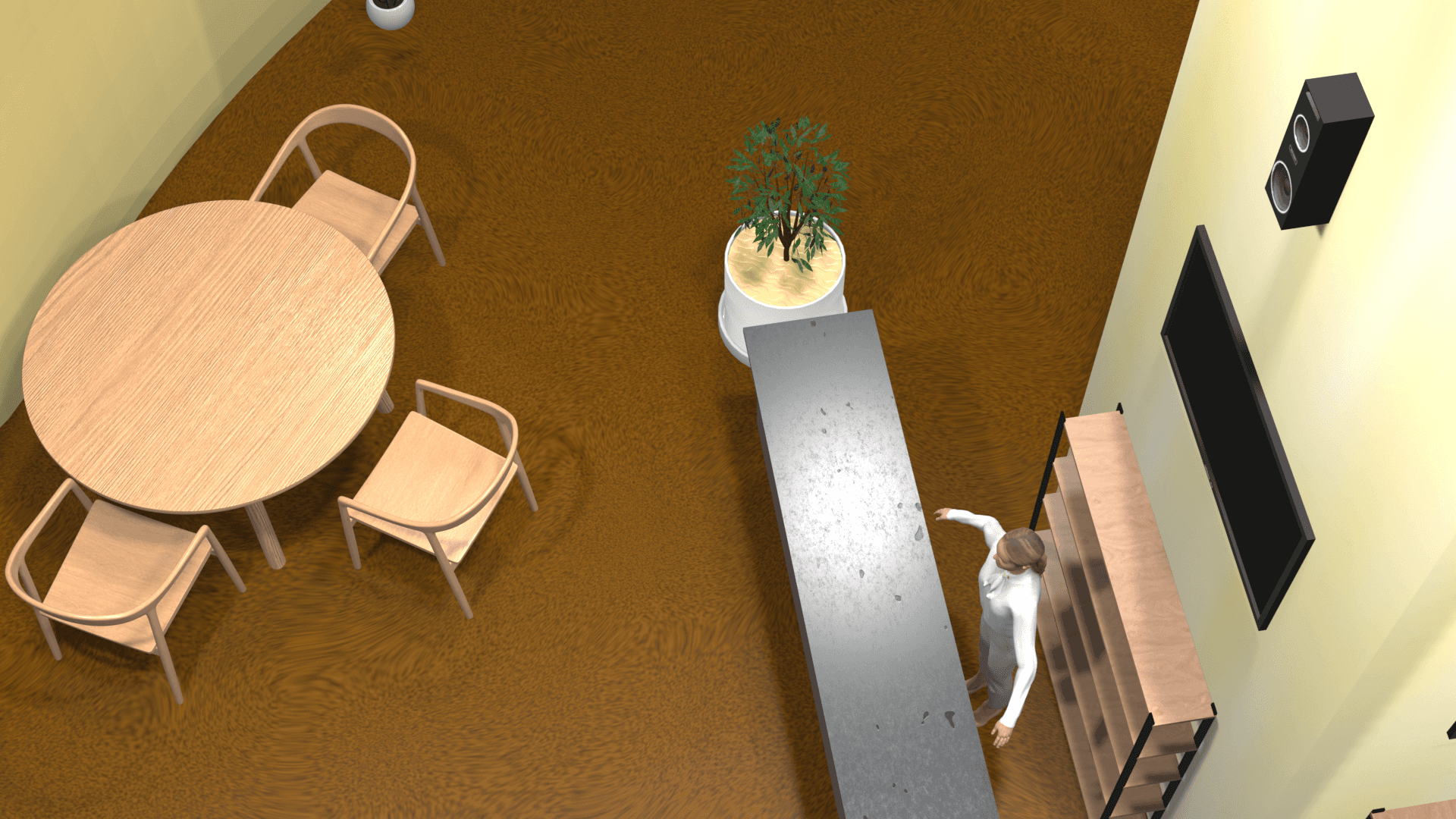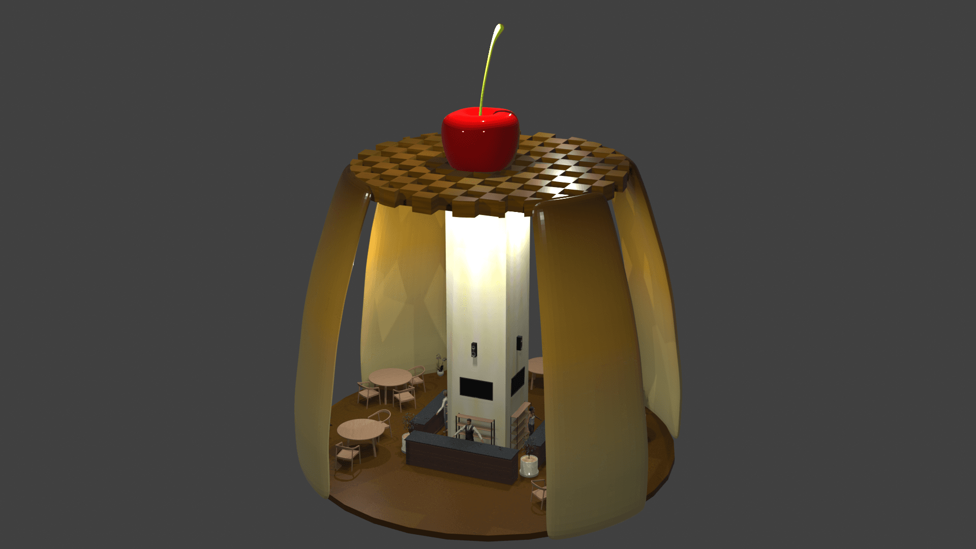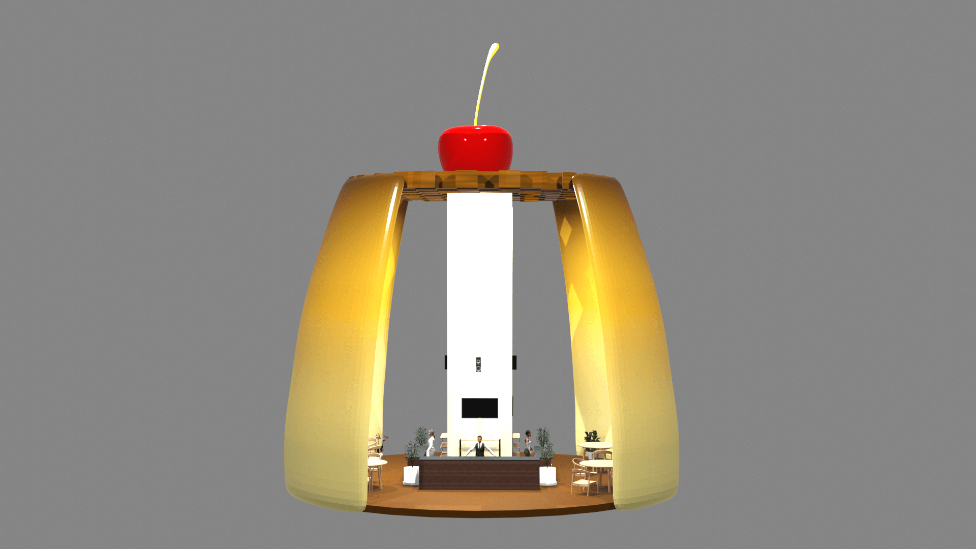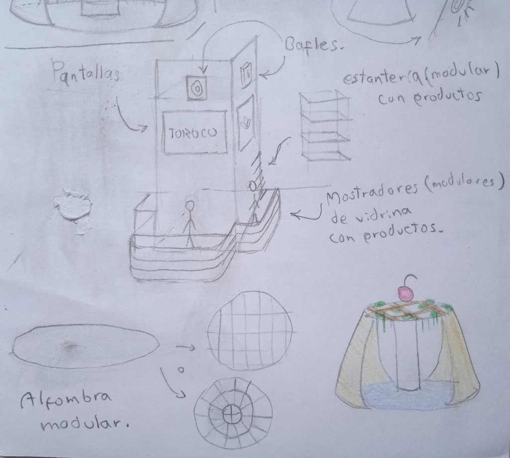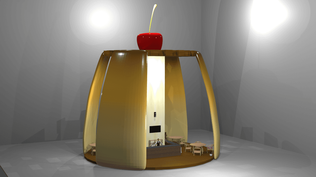 Por esto, se optó por una forma que captara la atención desde lejos, en este caso un flan. Asimismo, es un stand tipo isla que aporta una sensación de amplitud con el fin de que el público sea bienvenido a ingresar por sus diversas entradas, pero que al mismo tiempo, dentro del stand se sienta un buen trato y un ambiente que de un descanso del día a día.